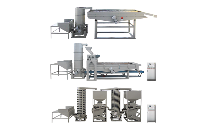 除殼單元:上料斗、螺旋提升機(jī)、雙通道螺旋提升機(jī)、殼仁分選機(jī)(2臺)。該單元可將仁與殼分選開。