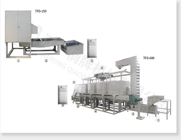 TFD-150型:① 綠豆脫皮主機(jī) ② 除糠篩 ③ 電氣控制柜