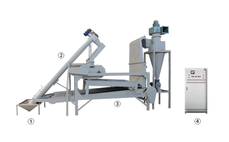 ①приёмный бункер ②спиральный транспортёр③главная машина (шелушитель, вибросито для удаления шелухи и вибросито для сепарации нелущённой семечки и ядра) ④электрический управляющий шкаф